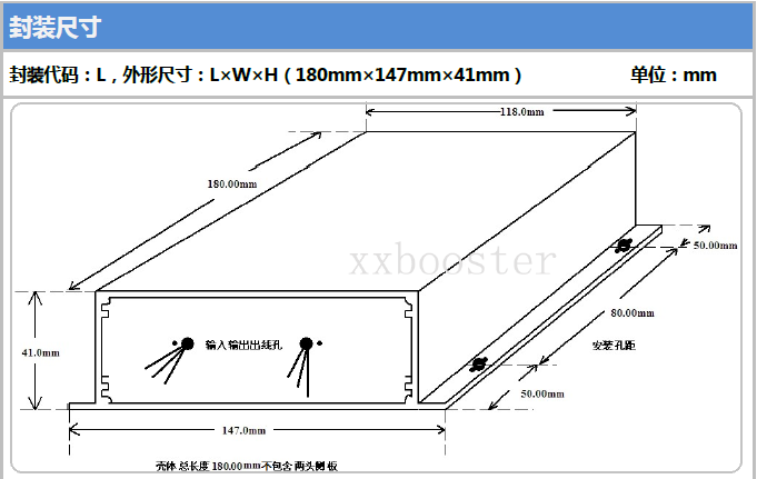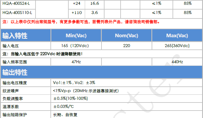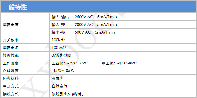 典型性能:金属壳宽压输入、单路输出,输入频率范围47Hz-440Hz,输出低纹波噪声、高稳压精度、长期短路保护自恢复、使用效率高,高隔离耐压。