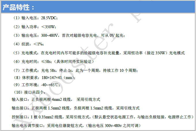 典型性能:宽压输入、输出300-480V可调,0V起充,纹波低。